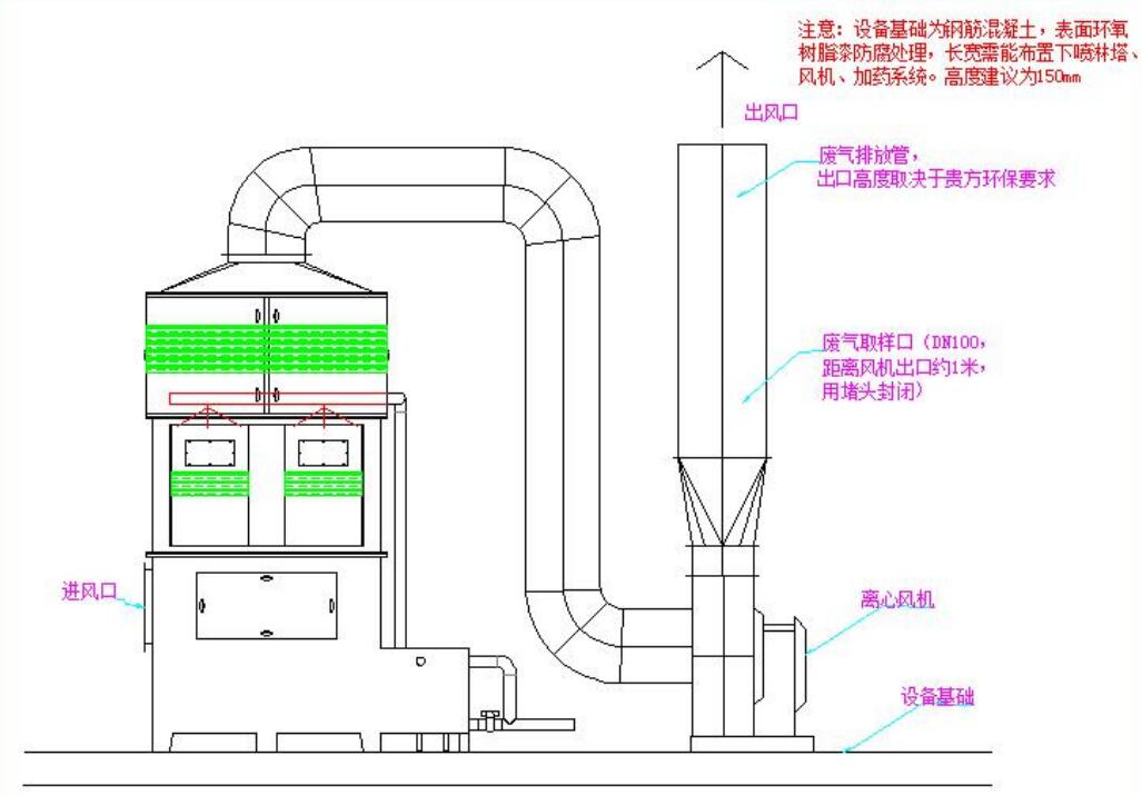廢氣從方形不銹鋼噴淋塔塔體下方進(jìn)氣口進(jìn)入噴淋塔,然后均勻地通過(guò)均流段上升到填料吸收段。在 填料的表面上,氣相中物質(zhì)與液相中物質(zhì)發(fā)生化學(xué)反應(yīng)。塔體的最上部是除霧段,氣體 中所夾帶的吸收液霧滴在這里被清除下來(lái),經(jīng)過(guò)處理后的潔凈空氣從噴淋塔上端排氣管 排放。吸收液在塔底經(jīng)水泵增壓后在塔頂噴淋而下,最后回流至塔底循環(huán)使用。
